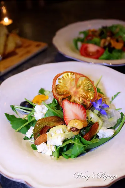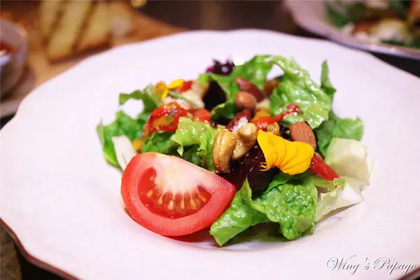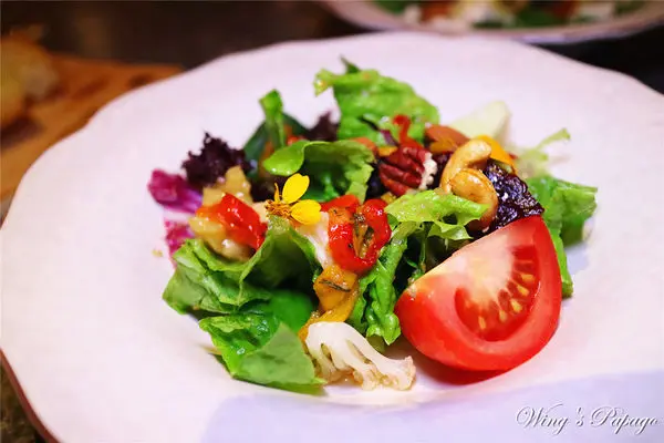 使用的大部分蔬菜及食用花為自家栽種,搭配薑汁蘋果醋。
