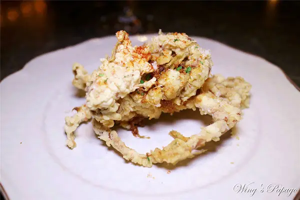 軟殼蟹裹上秘製乾粉經酥炸後整隻皆可入口,