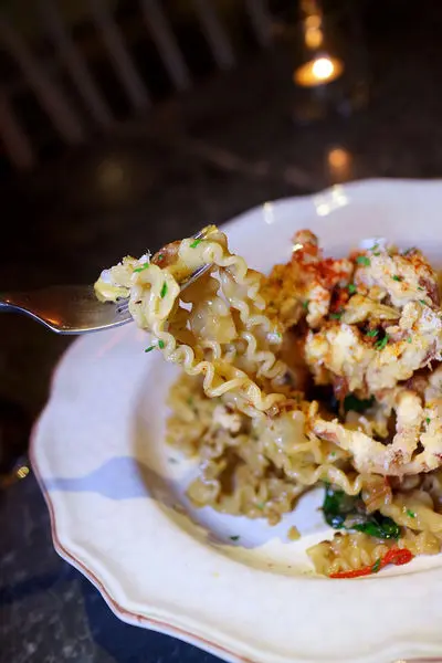 再放入餐廳自製波浪型裙擺義大利麵清炒,加上滿滿的起司,
