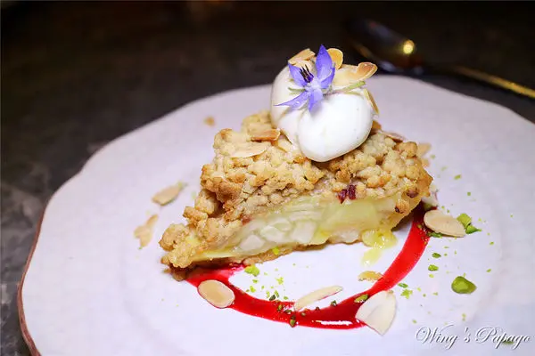 今天的主廚特製甜點是溫蘋果派,搭配自家製香草冰淇淋及食用花點綴,