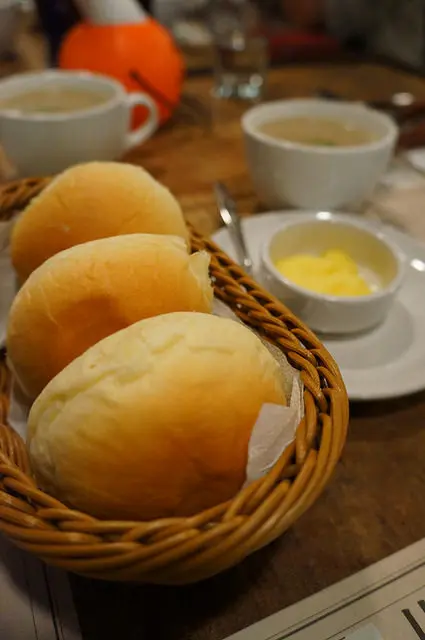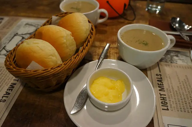 我喜歡她們家的很一般麵包跟抹起來會很肥膩的奶油,這種很一般的簡單麵包真的是簡單的好好吃,蘑菇濃湯我記得大家都有嫌說鹹了點,不然也是濃郁又好喝的