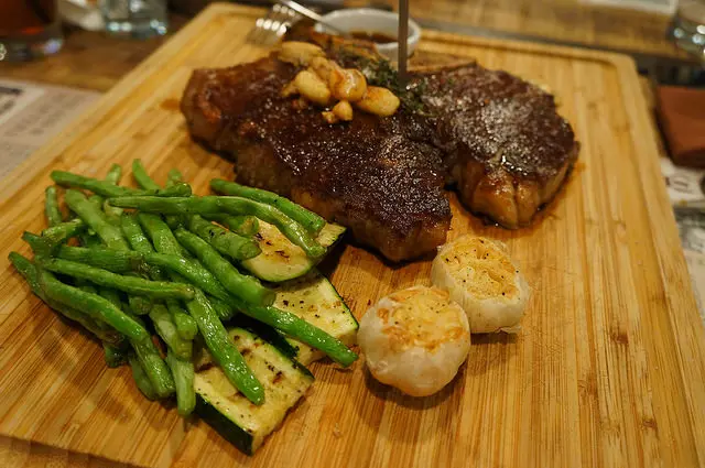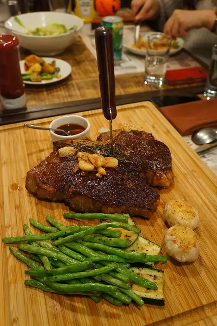 所謂丁骨牛排就是分別是一塊菲力牛排和一塊紐約客牛排,這兩塊部位的肉質口感不太一樣,菲力軟嫩,而紐約客比較有嚼勁和油花,丁骨牛排這樣的切割方式可以讓一塊牛排滿足兩種需求,份量也是大的驚人,光看我就感覺很飽了