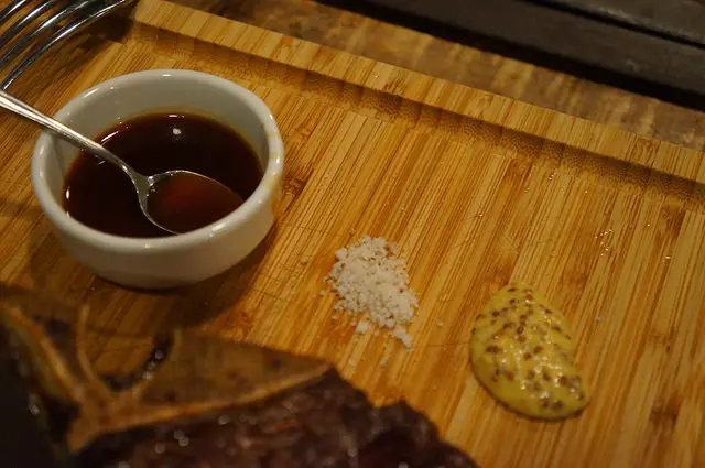 給了芥末子、海鹽與肉汁三種沾醬,其實我還滿愛肉汁沾醬的,讓牛排吃起來更是充滿肉汁淋漓的痛快感,肉汁淋在馬鈴薯泥上也是讓我愛死的一道美食