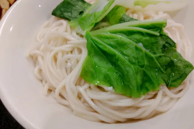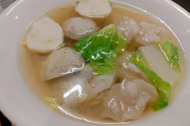 湯裡有餛飩、魚丸、貢丸和蛋包共四樣,同樣附上了小白菜,