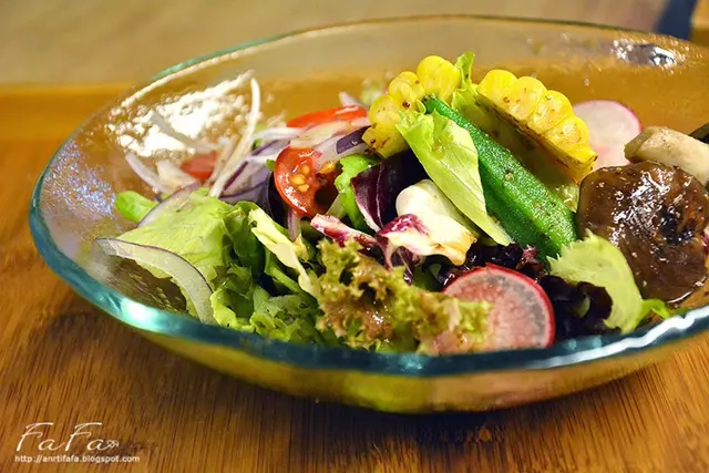 蔬菜種類相當豐富,由芥末籽、檸檬汁調配的和風醬汁酸香有勁,醬汁分量夠吃起來很清爽。