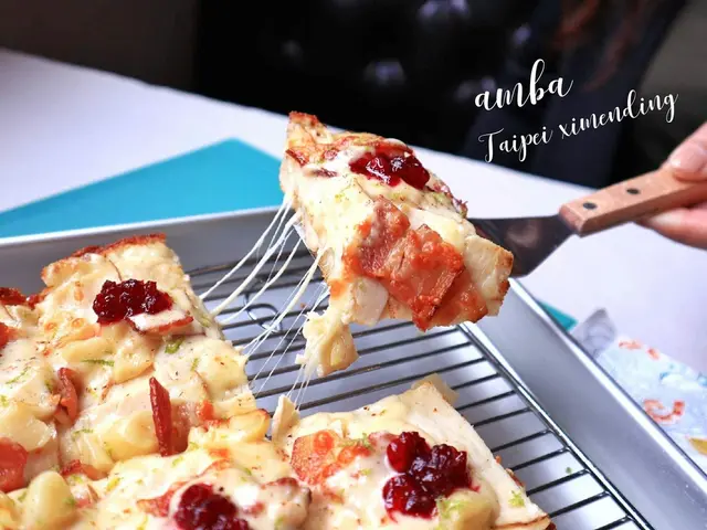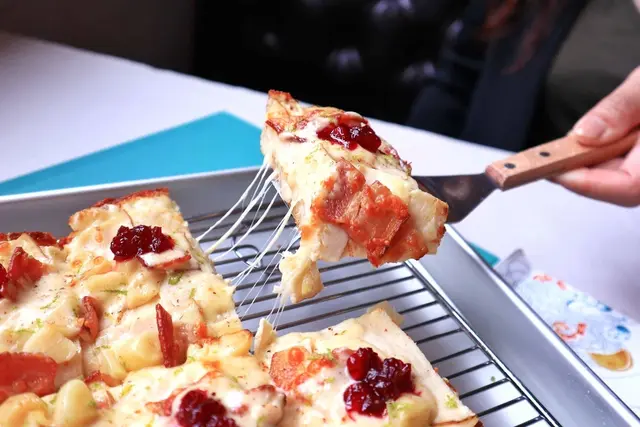 焗烤後的餅皮邊緣焦脆,內餡厚實有彈性,鋪上烤火雞肉片、醃燻培根 、酸甜蔓越莓、烤大蒜、綜合起司、白醬等,