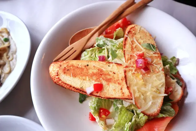 白盤內的沙拉在美好窗光下更顯的有慢食悠閒的氛圍,青脆爽口的生菜裡有鹹香帶醃燻味的鮭魚,配上二大塊長型大蒜麵包,很開胃的一道前菜