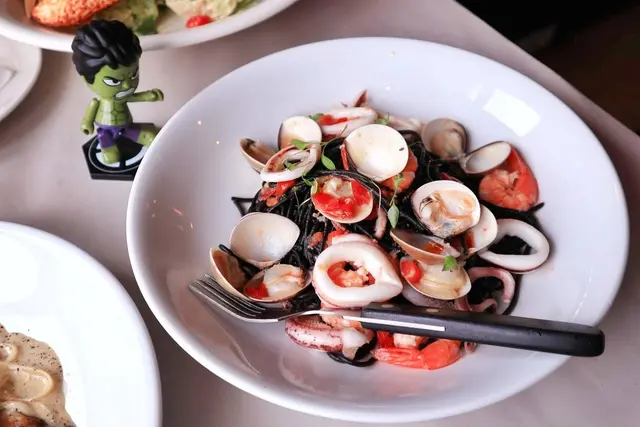 充滿異國風味的海鮮義大利麵,裡面有許多澎派的海味,像是小管、蛤蜊、鮮蝦等海鮮,