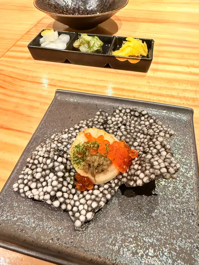 𓌉◯𓇋蟹膏墨雲干貝 - 鐵板香煎帆立貝,放上用鱒魚卵整成嘅薄脆,再加上蟹膏增加香味
