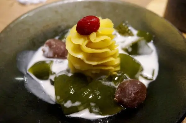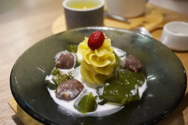 包括擠花的地瓜泥,抹茶凍,紅豆麻糬,另外淋上清爽的椰奶