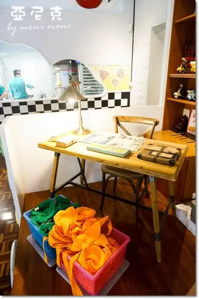 櫃檯旁可以看到有個復古小書桌,前方擺了兩箱服飾喔!