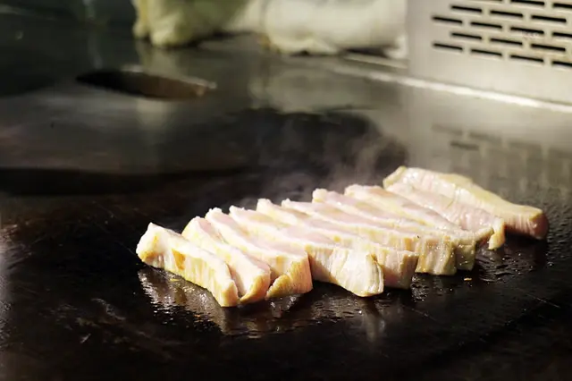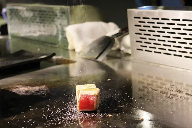 鐵板料理最迷人的就是高溫鎖住食材本身風味,看這鮪魚仍保留粉嫩色澤,而外圍方正熟透,間隔一致,可以看出鐵板師傅對於溫度的掌握了得