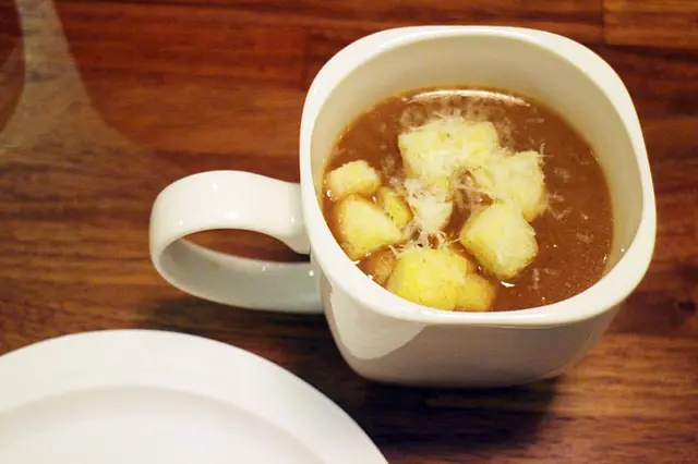 吐司塊成群躺在濃稠帶甜味的洋蔥湯上頭,一道溫順的湯品