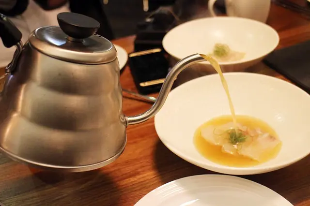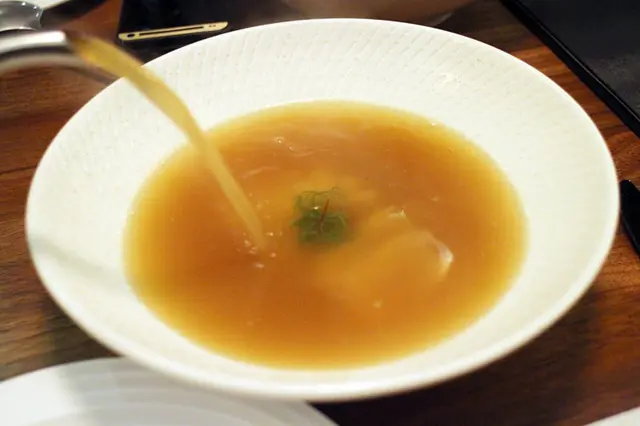 如看秀般,服務生緩緩將滾燙的高湯倒入切工極細的石斑碗公裡,盯著石斑瞬間熟透、鎖住美味