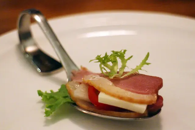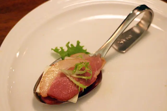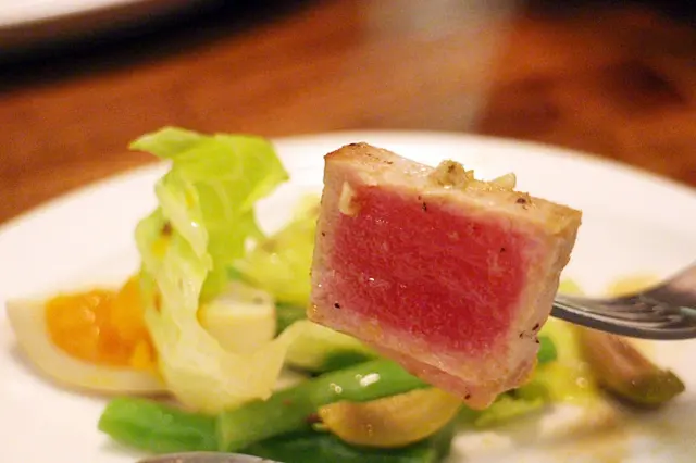 不得不讚嘆兔卡蕾餐酒館的開胃菜相當出色!以水梨爽脆化解鴨肉煙燻後可能有的嫌膩,而且這鴨肉光以外表就可以獲得滿分,鴨皮薄脆、鴨油清透和帶粉玫瑰色的肉澤,好的食材經由廚師妙手,讓人留下深刻印象