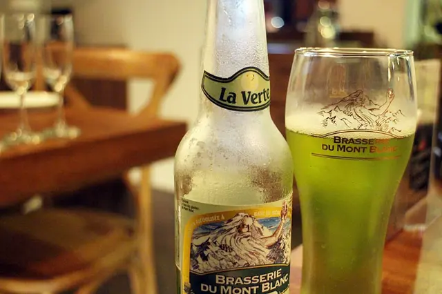水源取自阿爾卑斯山,海拔兩千公尺純淨、低礦物質的冰川水,融入東亞罕見苦艾草而成青蘋果色的「綠啤酒」