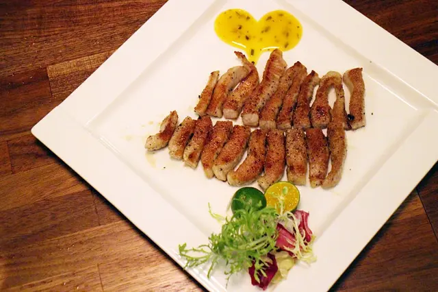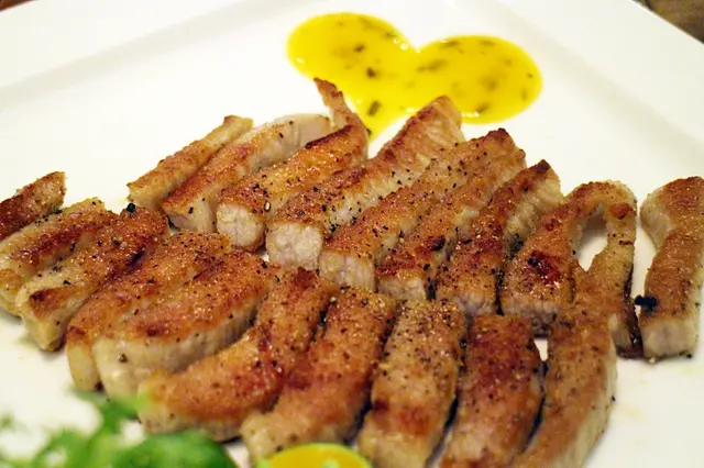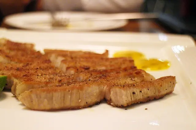 帶著脆度的松阪豬,上下兩面經鐵板煎後焦酥,撒上黑白胡椒,展現另外一種脆度,所以放入口中可以吃到兩種層次的脆,挺特別!