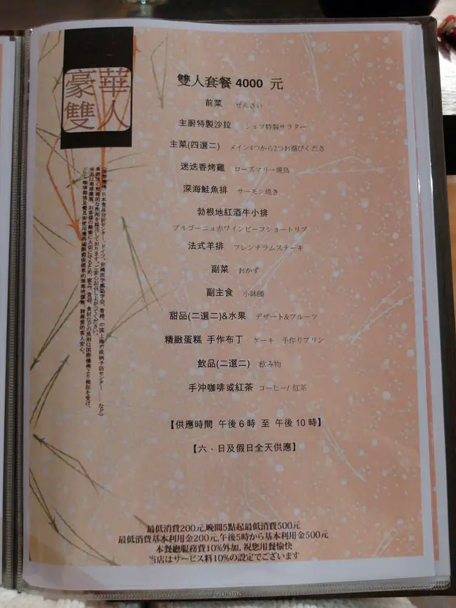 平日午餐下午茶時段低消一人200元,平日晚上和假日全天低消一人500元