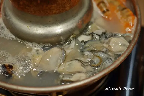 在這個酸菜白肉鍋一送上桌的時候,服務人員就先提醒我們要快點品嚐鮮蚵,