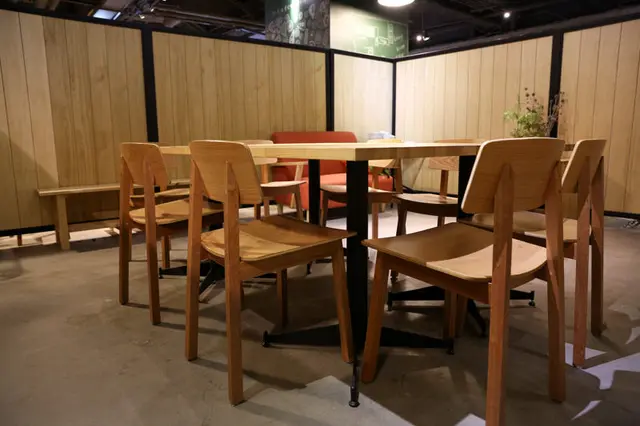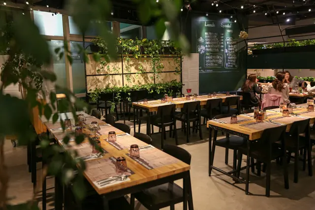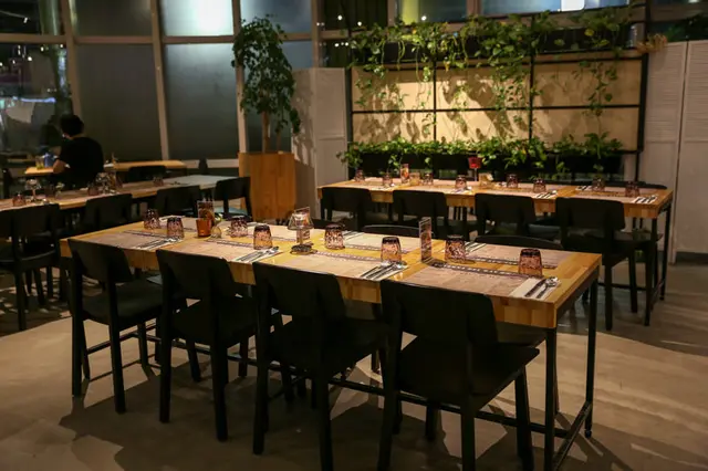 特別挑高的用餐區,位置和位置有一定距離,轉角必定有灌木和綠樹盆栽,非常典型的鄉村酒館