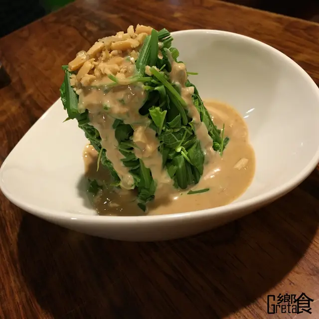 龍鬚菜做成塔在淋上胡麻醬並灑上花生