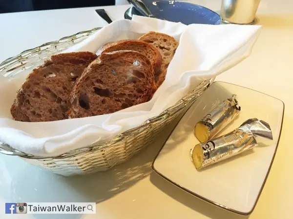 先上酸酵種麵包, 是他們自己做的, 旁邊的奶油是法國的高級奶油, 初跟美女公關見面就不顧一切的塗奶油  XD 因為很香呢