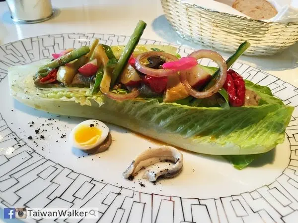 是以萵苣的芯做的, 配上醃過的鮪魚, 紅洋蔥, 鵪鶉蛋, 魷魚, 青豆