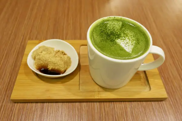 抹茶拿鐵附了黃豆粉蕨餅跟黑糖汁
