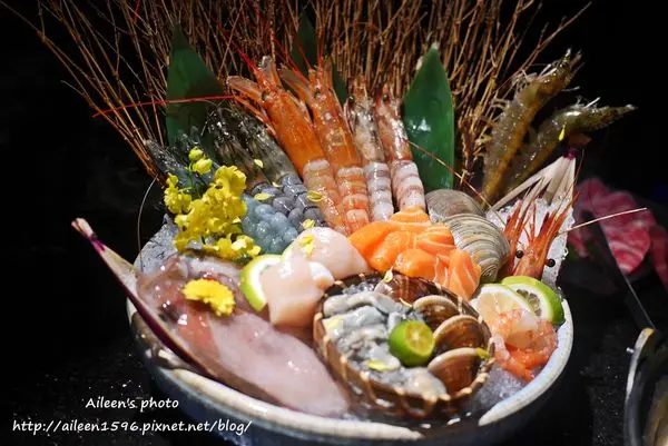 這個海鮮盤裡面有:明蝦、阿根廷天使紅蝦、草蝦、藍鑽蝦、甜蝦、沙蝦、生食干貝、東石鮮蚵、文蛤、牛奶蛤、鎖管、鮭魚。