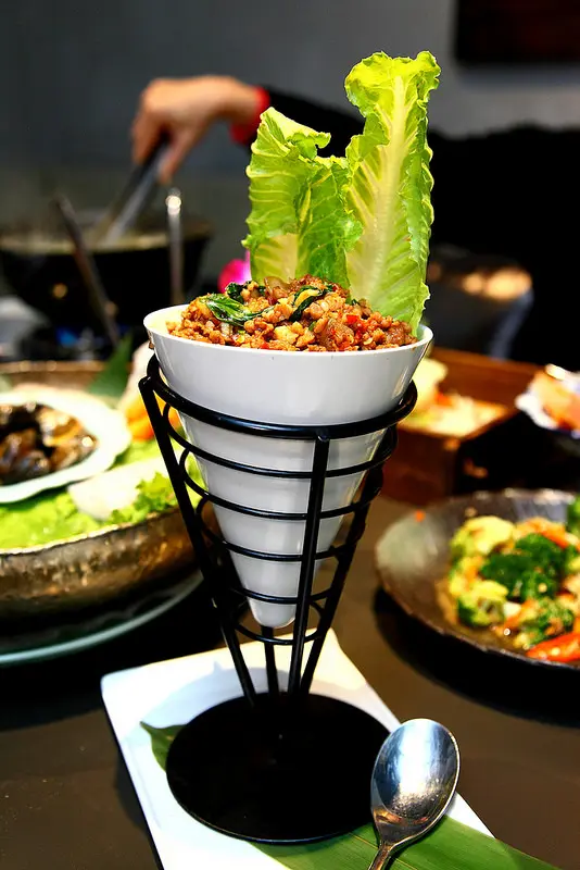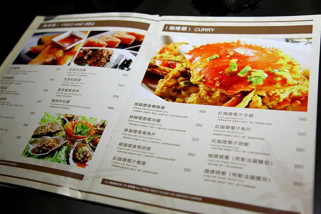 除了傳統的泰菜外,菜單中也可見到加入了緬甸,雲南,新疆等創意菜式