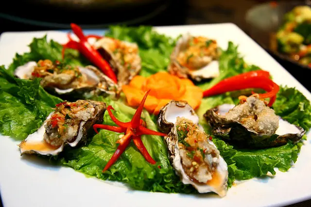 把能生吃等級的生蠔,奢侈的裹粉下去油炸,在淋上特調的酸辣醬汁