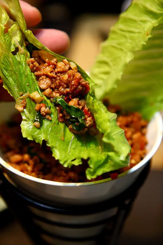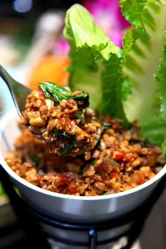 用生菜包裹一起享用,生菜脆爽水嫩的口感,能稍稍減緩打拋豬的辣度
