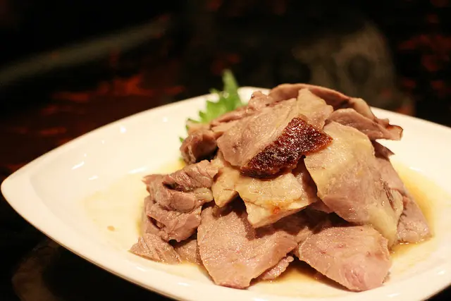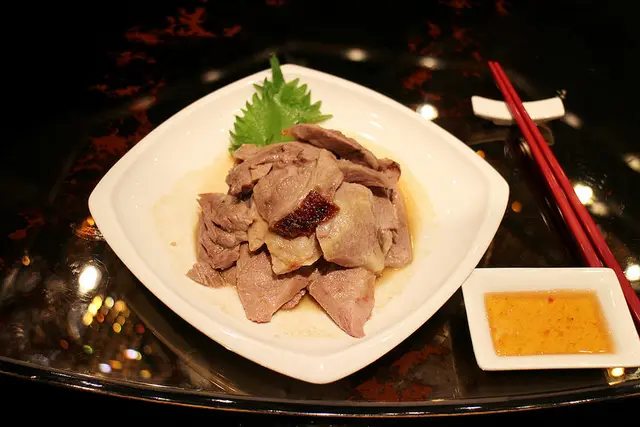 鴨肉部分直接沾冰梅醬一起品嘗,我覺得擁有一定溫度以上的鴨肉,吃起來口感會有和牛肉一般的錯覺
