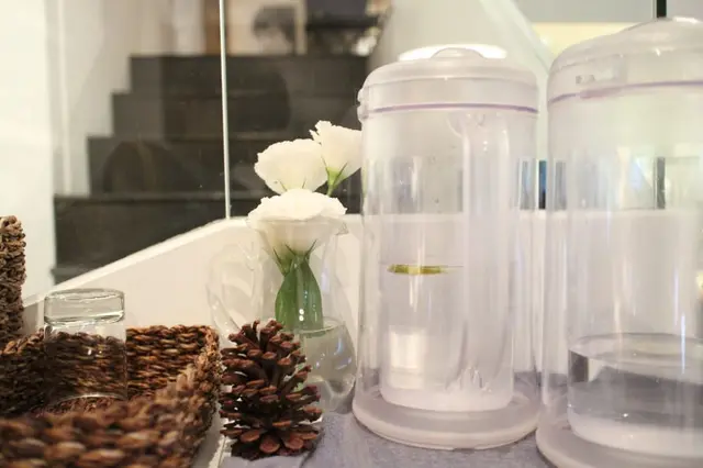 可以在書架邊,茶水架前看到不經意出現的白桔梗