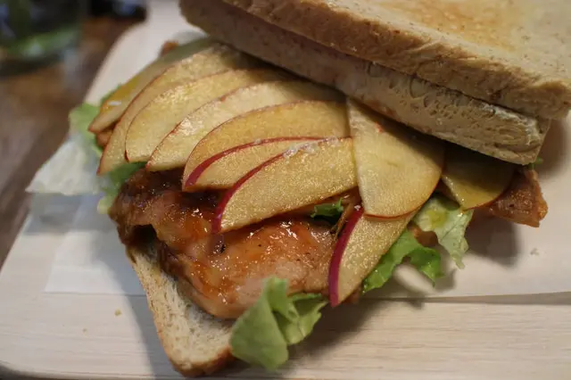 此時此刻的蘋果又甜又好吃!最喜歡蜜蘋果的香氣和甜美,帶皮削片的蘋果覆蓋在烤得稍微柴的里肌豬上頭,剛好溫柔了味覺也增添爽口的滋味,但還是和前面提到的馬鈴薯一樣,碳烤味道氣息濃烈到我猜想應該是碳烤三明治吧!就是台中很有名的碳烤三明治再加蘋果切片,較少讓人有驚艷的感覺,啊啊有更貼近的說法啦,就是中秋烤肉把土司烤的恰恰再夾豬肉片那種滋味,也許吐司可以在更好吃一點,不過我也是外行人這樣說太不負責任,從料理拼裝可以看出桔梗料理的用心,可惜口感還差一點,下次來很難在選擇三明治了說