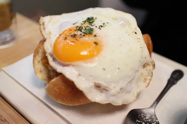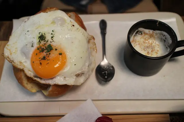 桔梗三明治提供的太陽蛋都是半熟蛋,就是那種讓人可吃爽爽也弄得髒兮兮的那種蛋,開朗在前一刻才提醒朋友小心蛋汁喔!下一刻就是自己留滿桌蛋汁XD