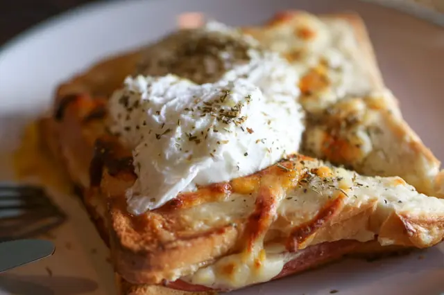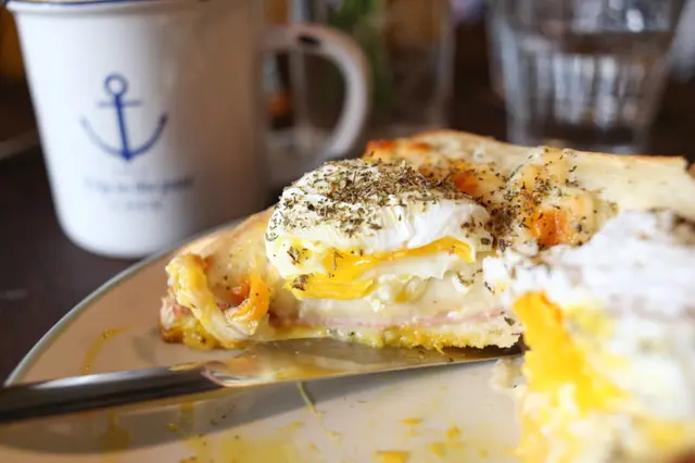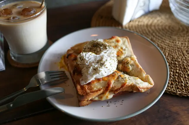 烤得外緣酥脆的吐司,鹹香起司和火腿,幾近完美的滑嫩水波蛋,有飽足感又美味的小點