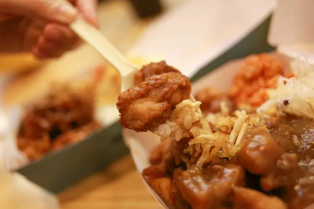 來了來了!炸雞的肉質很嫩,小小一塊的帶皮炸雞,皮薄肉軟,給它分數很高喔!