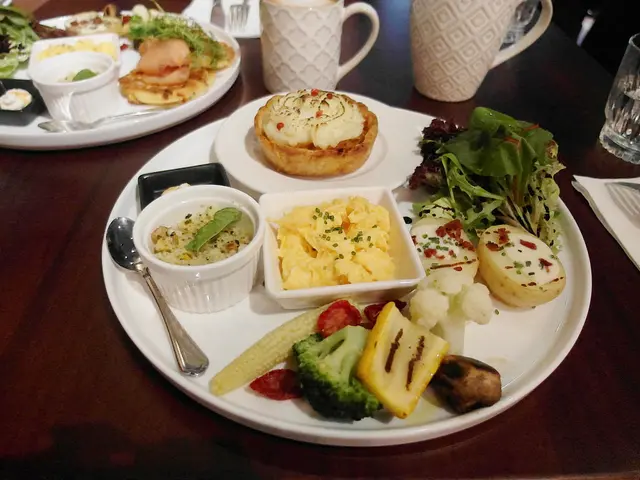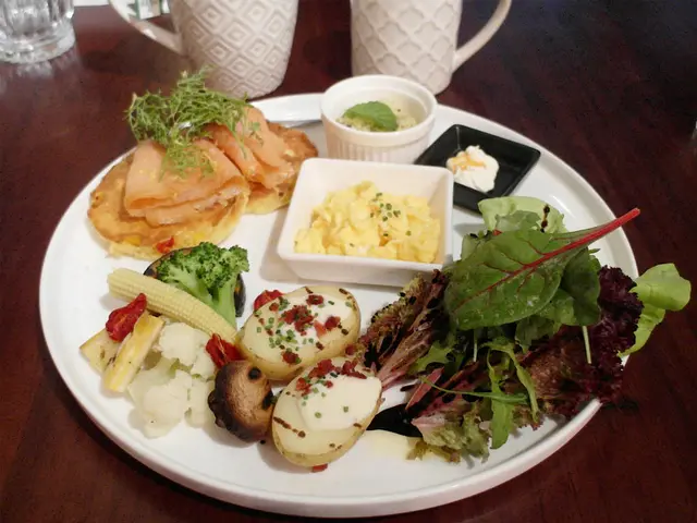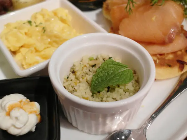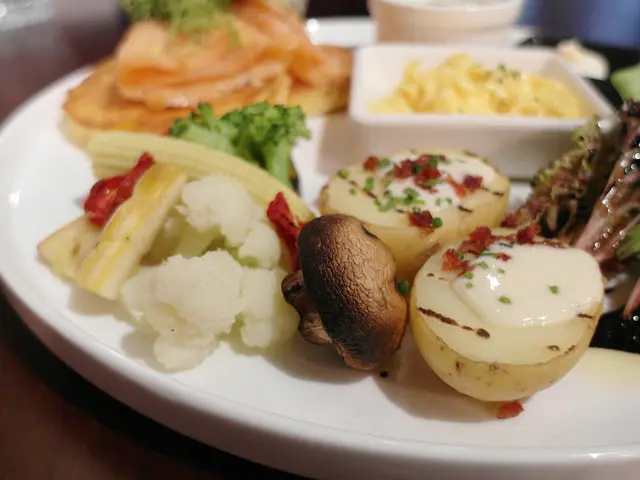 三色英式鬆餅與煙燻鮭魚、白松露炒蛋、烤馬鈴薯佐藍紋起司醬、炙燒綜合什蔬與佐陳年酒醋沙拉、北非小米、咖啡或茶