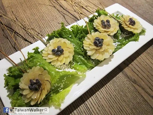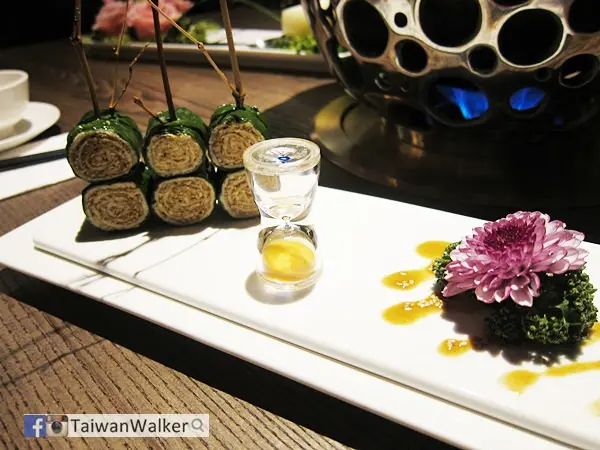杏香野菊,這個是一定要點的,杏仁片舖排像菊花一樣,裡面中間的心是蝦漿跟紫色的玉米,底部還有茄子跟海苔片,放進鍋裡四分鐘,就可以吃了。吃起來非常爽脆,我本身沒有很愛吃杏仁片,也覺得這個很好吃