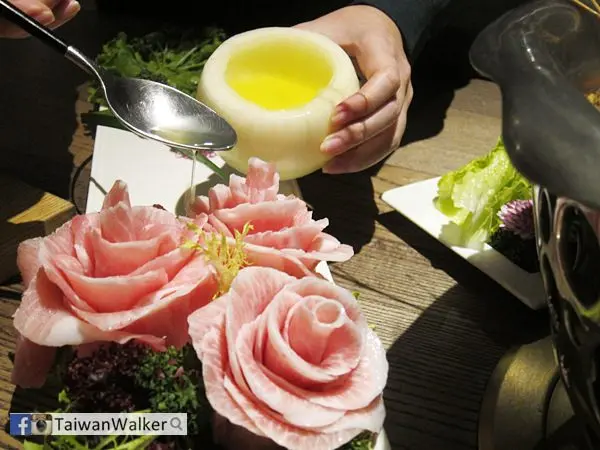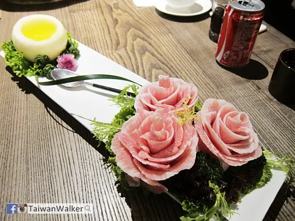 擺成玫瑰的形狀,非常的漂亮。煮之前店員加了蛋白,增加滑順感
