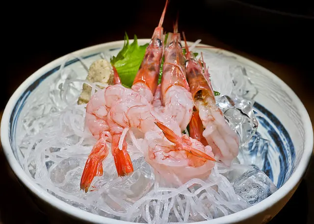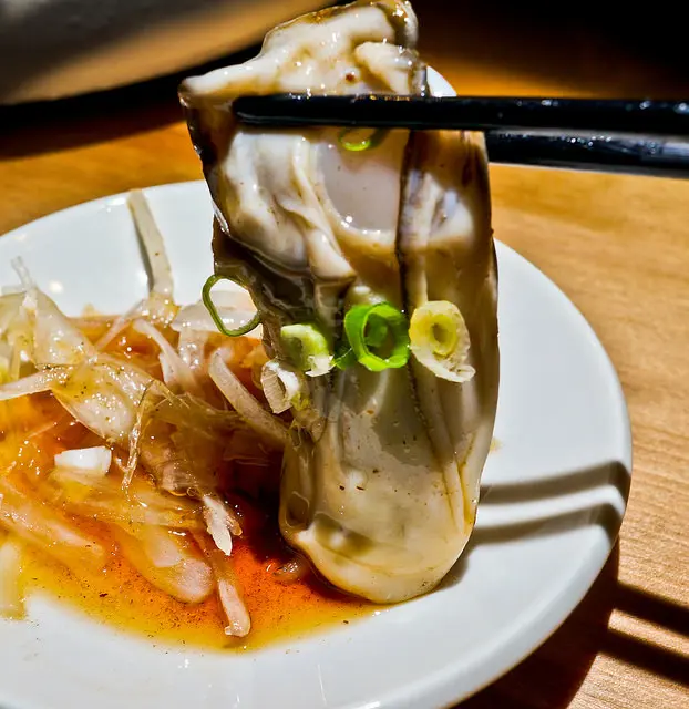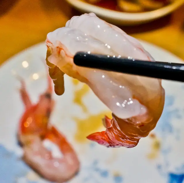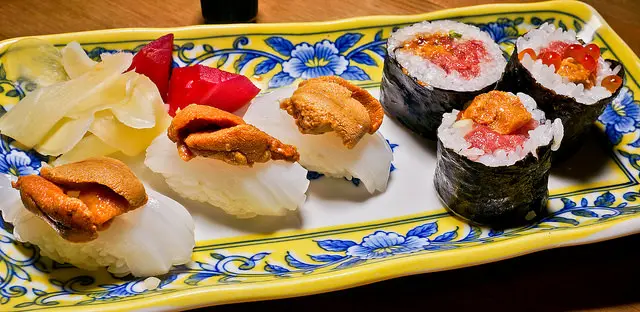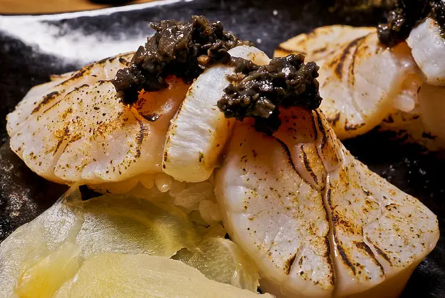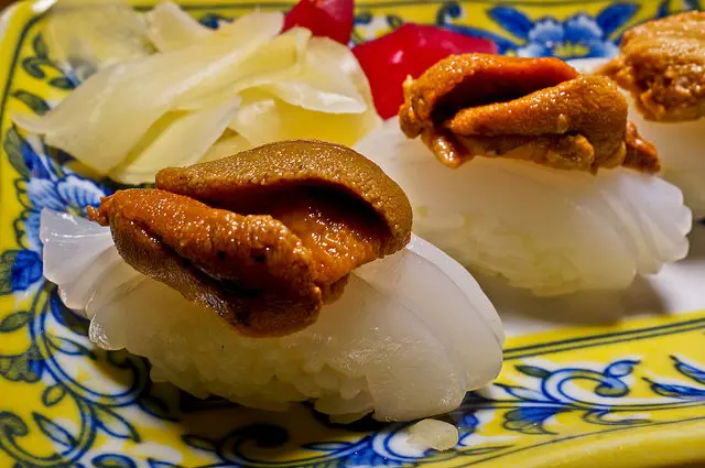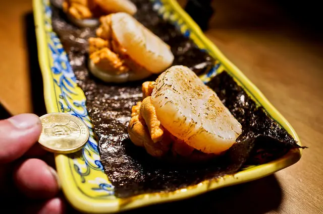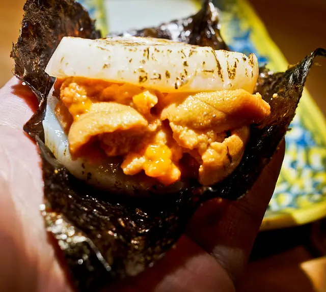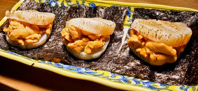 用很厚的干貝中間切開,填上上好的海膽,再用海苔包起來吃
