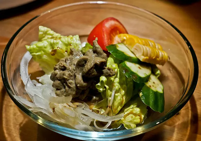 不是用傳統的醬汁,改用放在壽司上的蟹膏,適度的把菜葉沾上一點再吃,濃郁的口感,與一般沙拉又不同