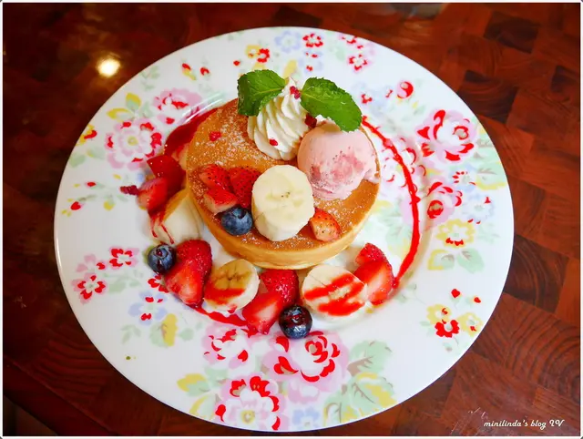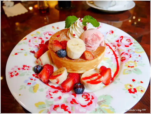熱蛋糕上方擺放著草莓冰淇淋、鮮奶油與水果