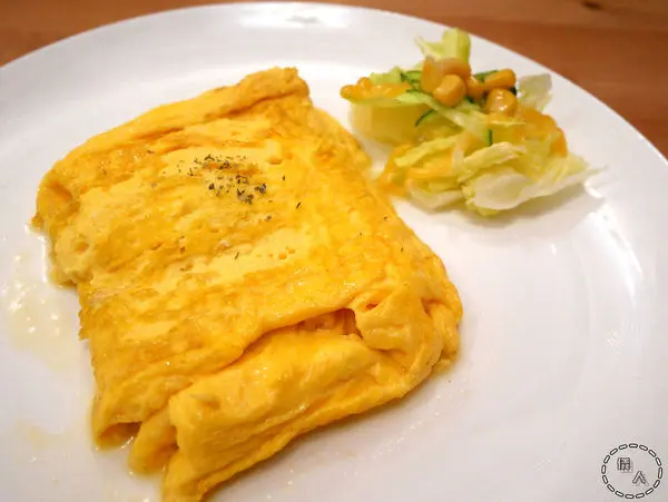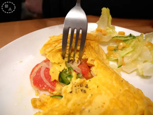 滑嫩嫩的歐姆蛋內包著蕃茄、洋蔥、小黃瓜、玉米,