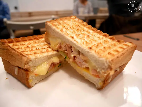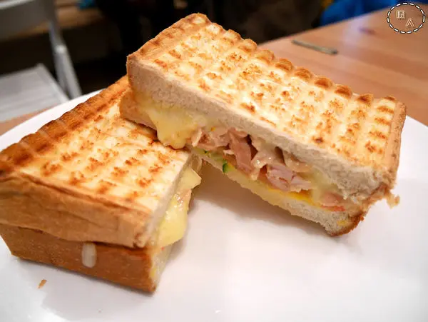 用厚片的鮮奶吐司壓上帕尼尼格紋,略焦越能顯出鮮奶的香,
