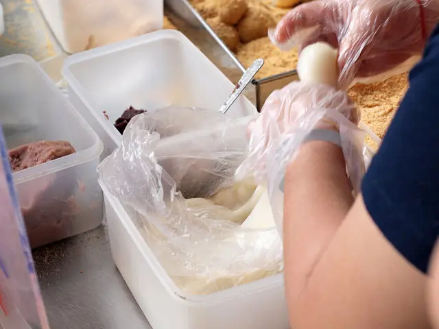 把麻糬切半,才發現“花生” 和“芝麻” 這兩個口味包裹著的是粉餡~