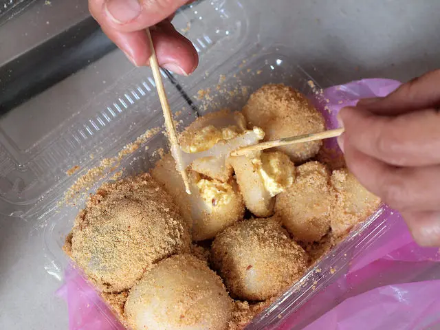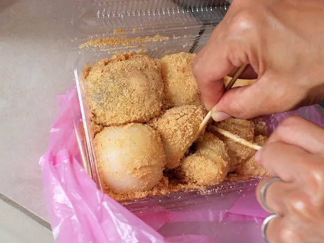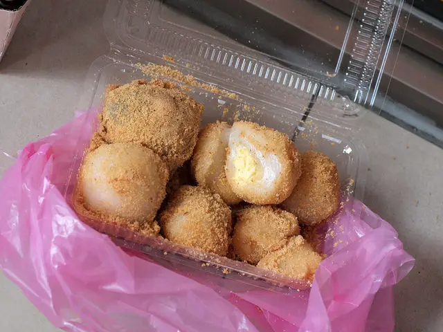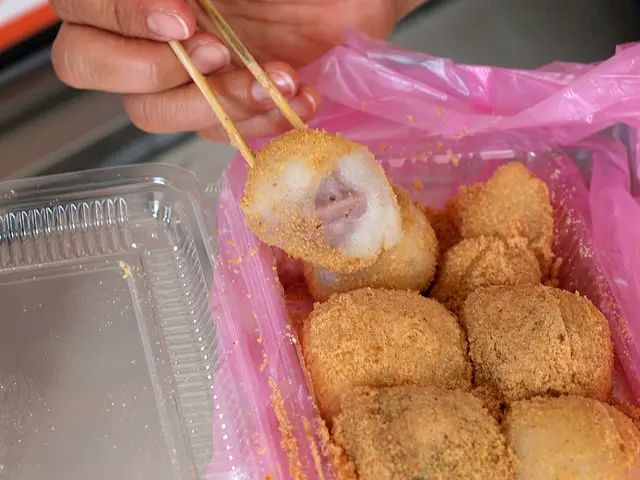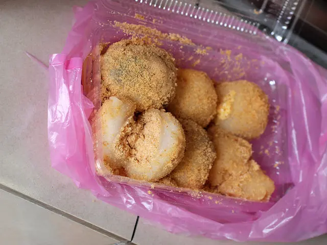 這是“原味” 不包餡的小麻糬四個擠在花生粉裡。