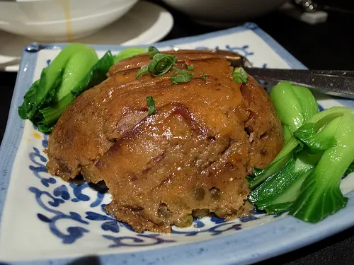 芋頭粉蒸肉(?) 雖然看起來油膩,但油都被芋頭吸收了,切成薄片的肉與芋頭幾乎融合一體,底下墊的豌豆沒有豆腥味道,反而粉糯酥鬆,意料之外好吃。