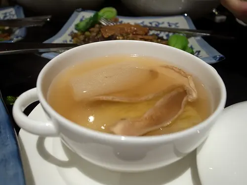 開水竹笙白菜,使用的是高貴的娃娃菜,湯清如水,可是吃得出是雞湯熬燉而成,裡面有幾片乾菇味道很特別,或許是師傅自己帶的吧,大陸有很多台灣沒有的菇類 。這次人少戰力弱,大家都扒一碗飯以上,吃得很飽,然飯後不來點小酒怎麼能結束週末夜晚,我帶著友人們下樓,開了一瓶酒,用我的杯子一起喝,微醺中大家道別,好個散逸的週末!
